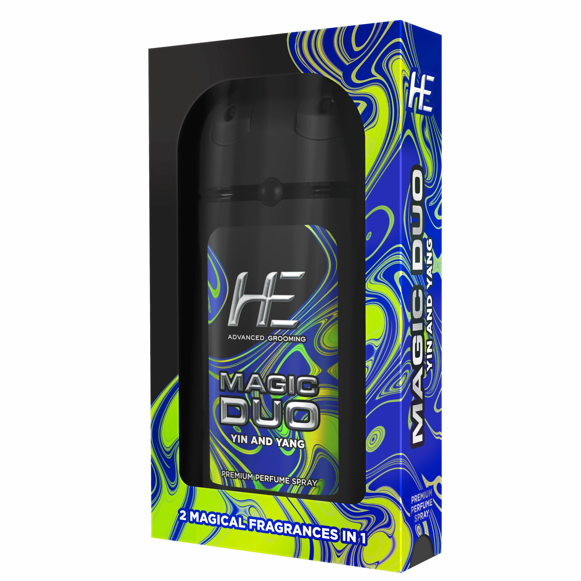 HE Magic Duo offers two variants 'Angels and Demons' and 'Yin and Yang' both of which come in a cool masculine matte styled finished pack of 50 ml*2 = 100 ml inside a premium looking carton with a transparent window. The unique applicator at the top of the can is positioned side by side and can spray two different fragrances separately or together.