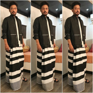 Look 15 - Irrfan in with a lot of black, monochrome looks coupled with perfect patterns and quirky touches wearing Jacket and Lungi by Abraham and Thakore, Sandals by West Coast Footwear Company.