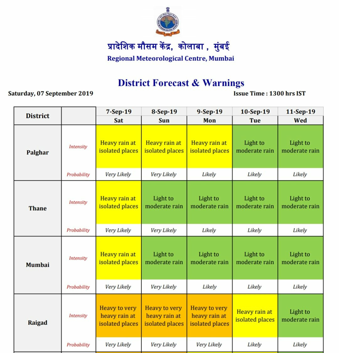 Forecast for 16-09-2019:Heavy rainfall likely to occur at isolated places in districts of Palghar and Raigad.