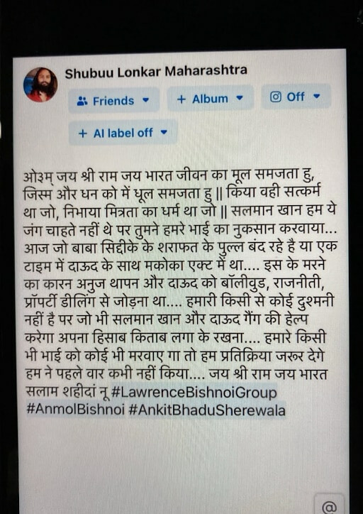 A Facebook post by a gang member, which has now gone viral, said the murder was due to Siddique's ties with Bollywood actor Salman Khan and underworld figures Dawood Ibrahim and Anuj Thapan.