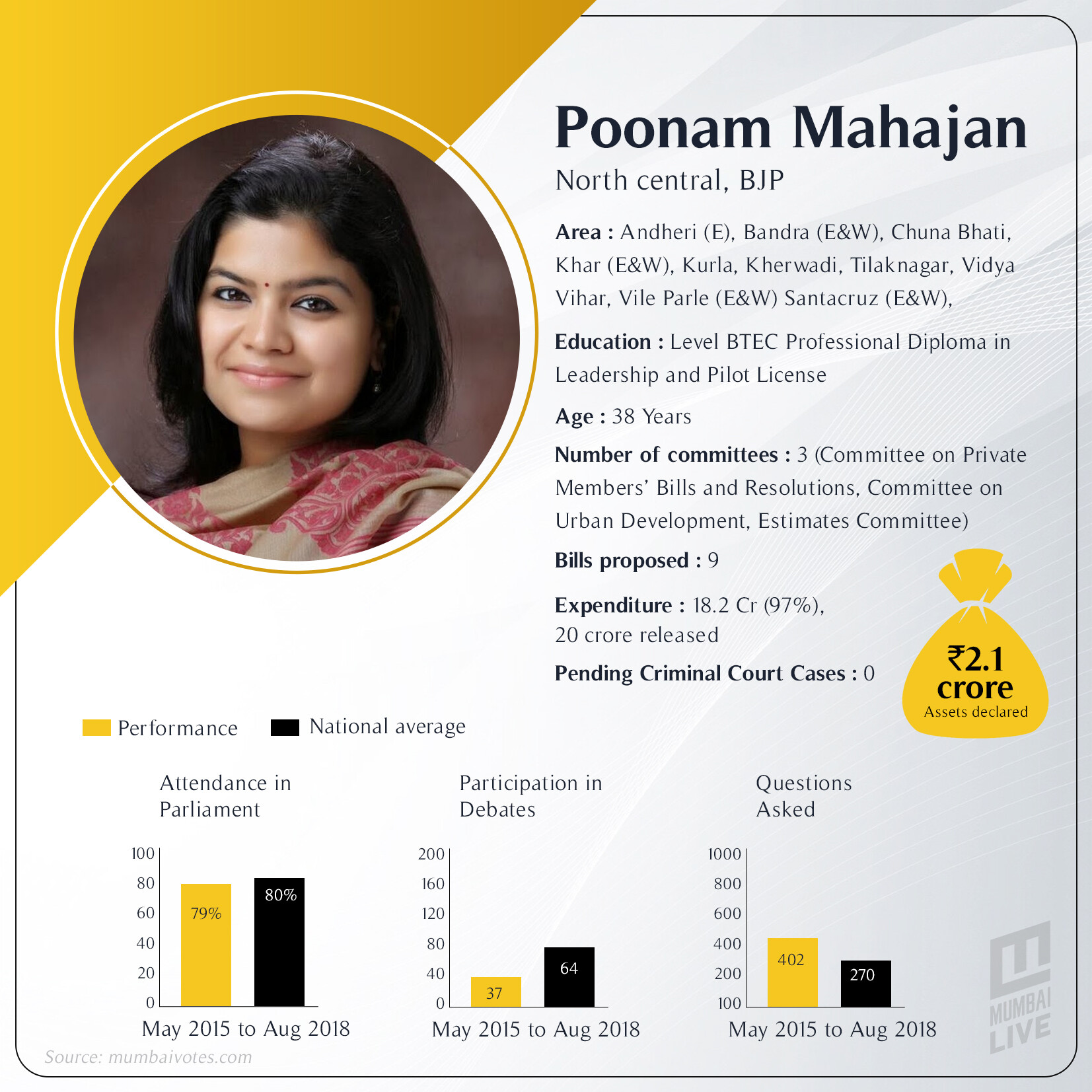 Poonam Mahajan, the daughter of late Bharatiya Janata Party (BJP) leader Pramod Mahajan, is contesting the 2019 Lok Sabha election from Mumbai North-Central constituency. Mahajan (38) is the sitting MP from the same constituency and is fielded yet again by BJP and Shiv Sena alliance.