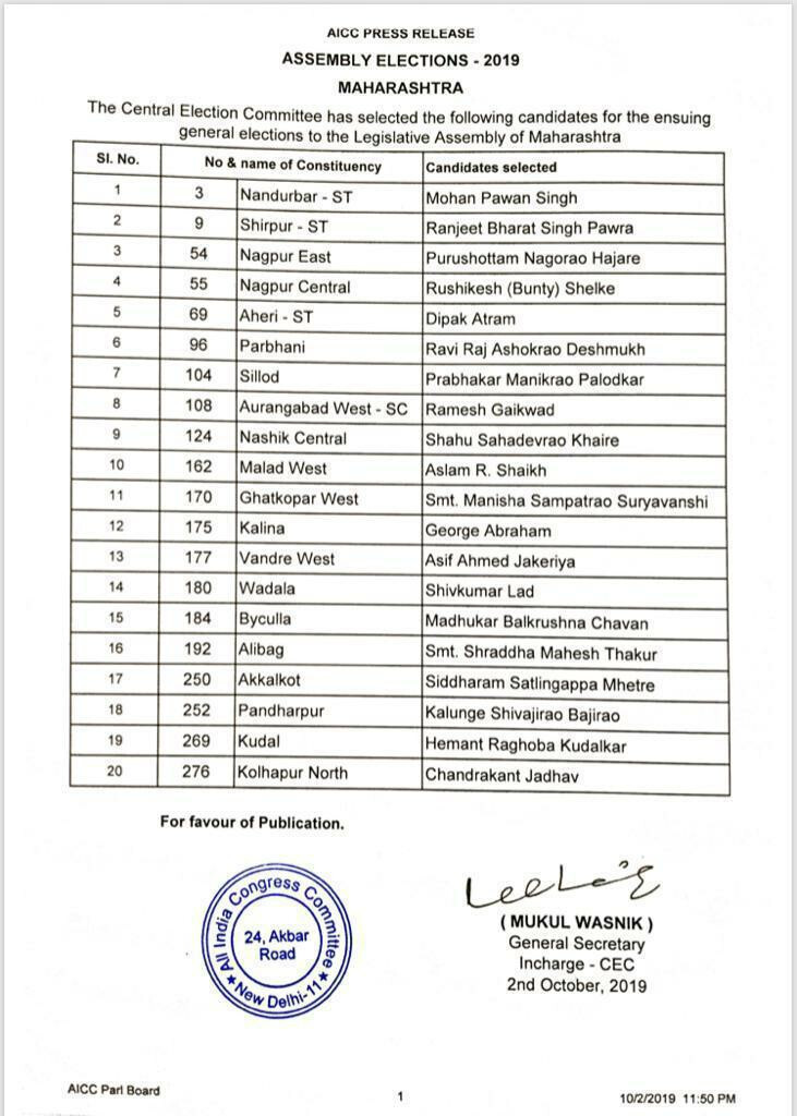 Congress on Wednesday released its third list of candidates while naming 20 contenders who will contest 2019 Maharashtra assembly elections scheduled on October 21.