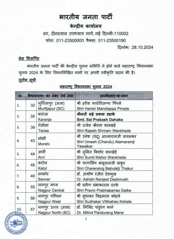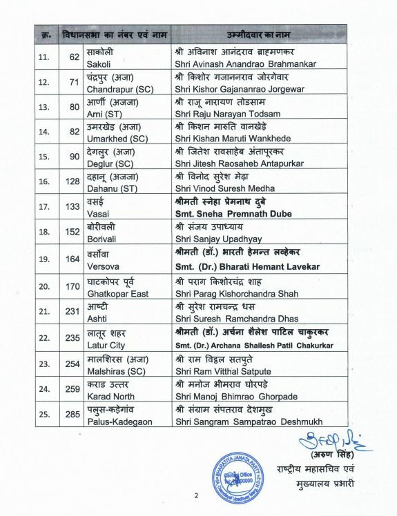 BJP on Monday announced the names of 25 more candidates for the Maharashtra Assembly elections. The party has nominated Sanjay Upadhyay from Borivali seat of Mumbai.
