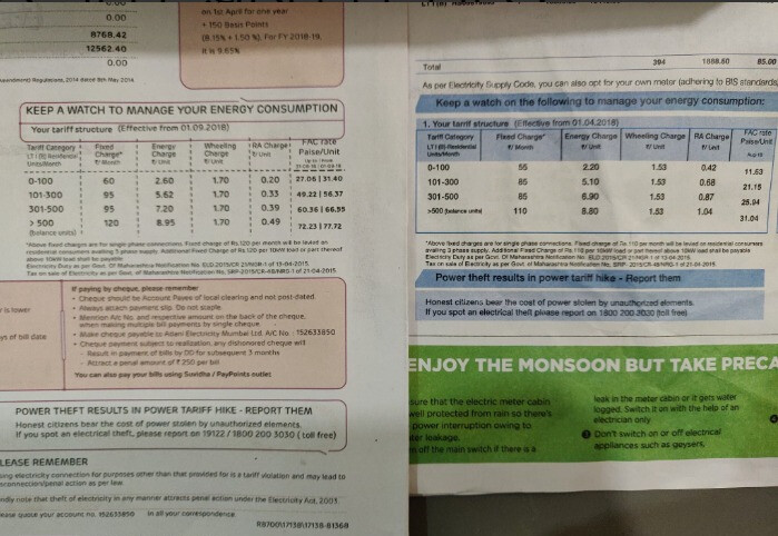 Comparing the bills, Nirupam pointed out that the fixed charge has been increased from ₹55 per month to ₹60 for the "0-100" tariff category. The fixed charge for tariff categories, "101-300" and "301-500", has also been increased by ₹10 each. The Fuel Adjustment Charge Rate, Wheeling Charges, Energy Charges per unit have been increased too as per the documents produced by Sanjay Nirupam.