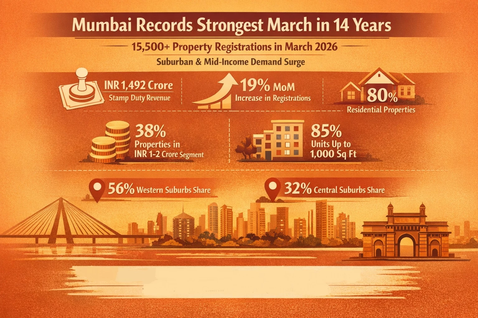A key trend observed in March 2026 was the shift toward mid-segment housing. Properties priced between INR 1–2 crore saw their share rise significantly to 38%, up from 32% last year.