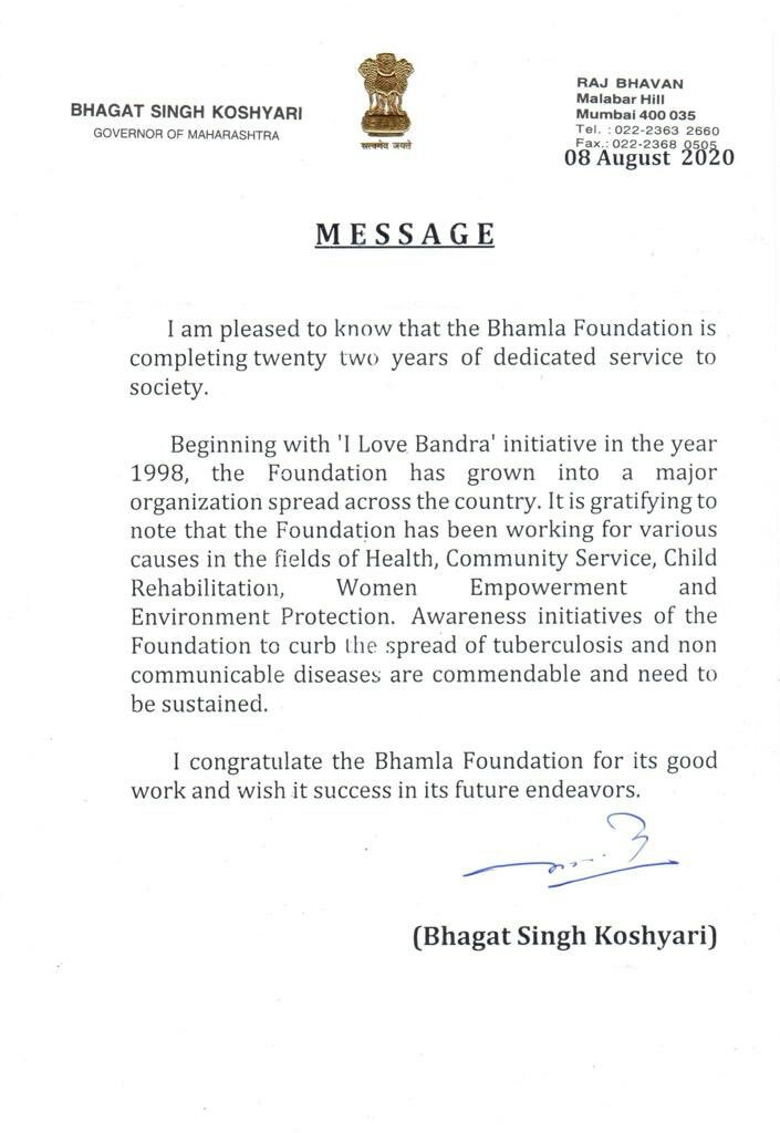 In a recent event, Asif Bhamla was invited by the Hon'ble Governor of Maharashtra, Bhagat Singh Koshyari, who presented them with a letter of appreciation. The team visited the Raj Bhavan and were felicitated with the letter which read, "I'm pleased to know that the Bhamla foundation is completing twenty-two years of dedicated service to the society. Beginning with 'I Love Bandra' initiative in the year 1998, the foundation has grown into a major organisation spread across the country. It is gratifying to note that the foundation has been working for various causes in the field of health, community service, child rehabilitation, women empowerment and environment protection. Awareness initiatives of the foundation to curb the spread of tuberculosis and non-communicable diseases are commendable and need to be sustained. I congratulate the Bhamla foundation for its good work and wish it success in the future endeavours."