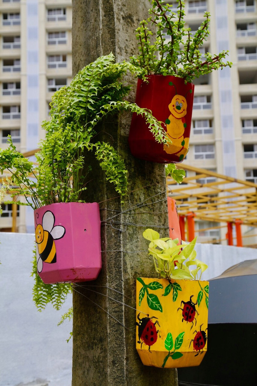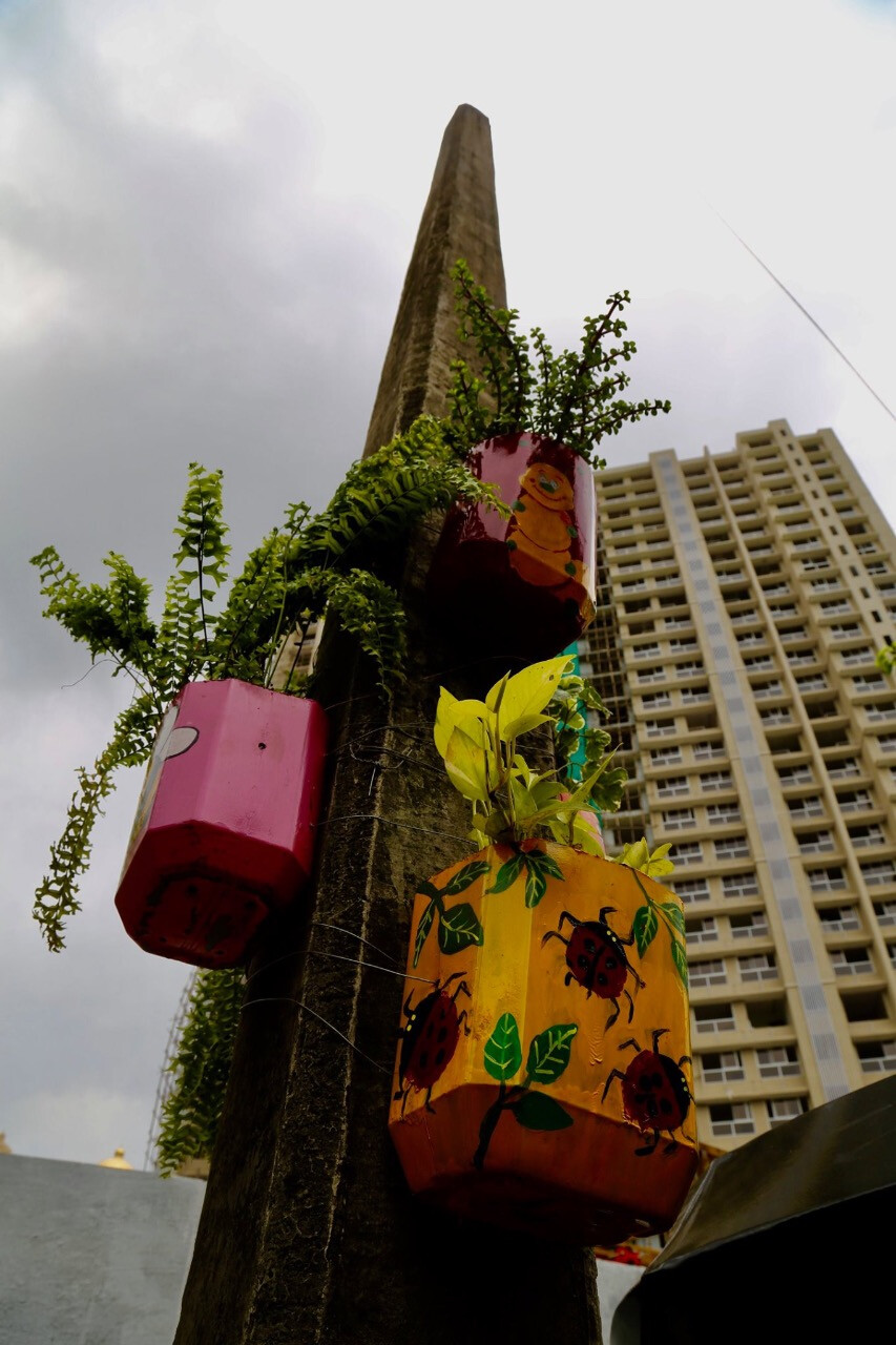 Later, they grouped up with 4-6 members for each vent and painted over discarded oil cans, water bottles, and paint tins. Each group adapted a different theme for their pillar. Some doodled faces, flowers, abstract art and insects while others sent environmental messages. They were helped by good Samaritans who wholeheartedly donated pots, soil, and plants.