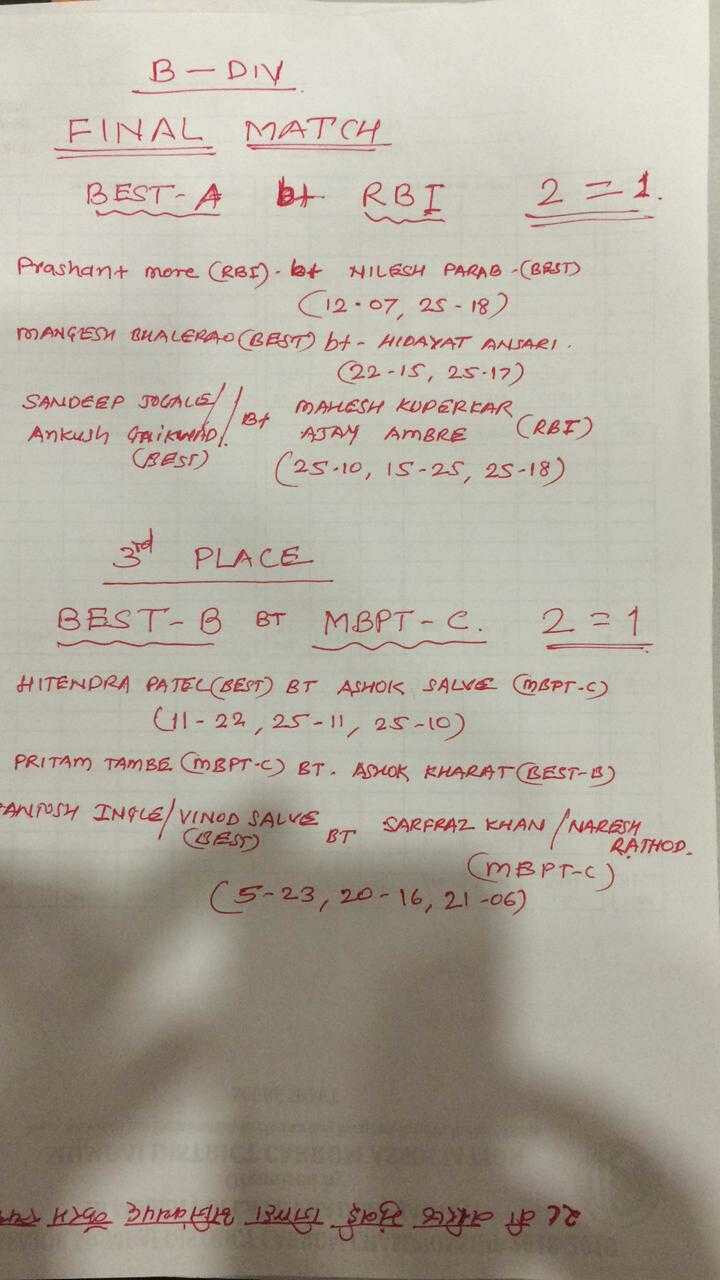 In the meantime, BEST-A’s Nilesh Parab was defeated 12-7, 25-18 by RBI’s Prashant More. However, Mangal Bhalerao managed to score a point for BEST as he defeated Hidayat Ansari 22-15, 25-17 to set the scores level. As the deciding doubles match happened, BEST’s Sandeep Jogale and Ankush Gaikwad beat Mahesh Kuperkar and Ajay Ambre from RBI in a close 25-10, 15-25, 25-18 encounter.