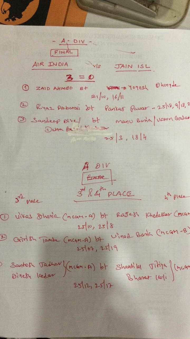 Air India’s Zaid Ahmed won 21-10, 16-11 against Jain ISL’s Yogesh Dhongde in the first match of the tie. Later, Riyaz Akbar Ali beat Pankaj Pawar 25-18, 9-18, 25-18 to win the second fixture and eventually, the doubles team of Air India managed to seal the game for their team by beating the opposition by 25-3, 18-4.
