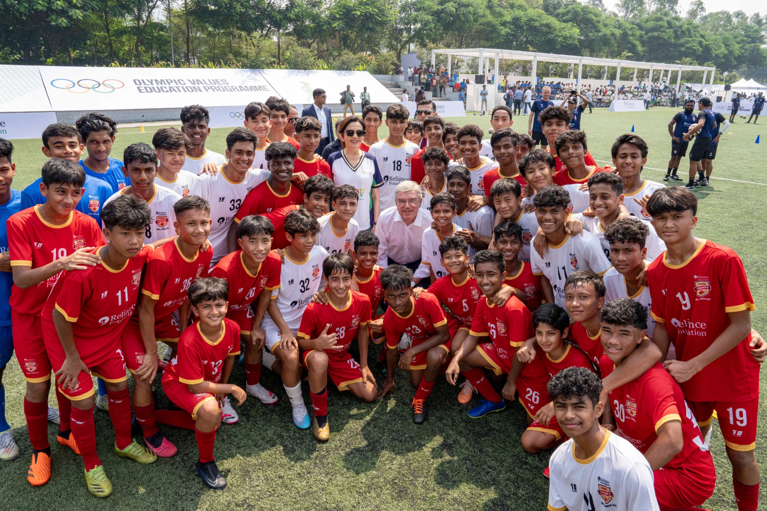 The new cooperation was agreed upon by IOC President Thomas Bach and Nita Ambani, IOC Member in India and Reliance Foundation Founder Chairperson, during a visit to the Reliance Foundation Young Champs (RFYC) football academy in Mumbai. During the ceremony, President Bach and Mrs. Ambani exchanged pennants representing OVEP and Reliance Foundation and joined students in leaving their handprints on a new Olympic Values Pledge Wall, marking a commitment to be a positive role model both in sports and in day-to-day life.
