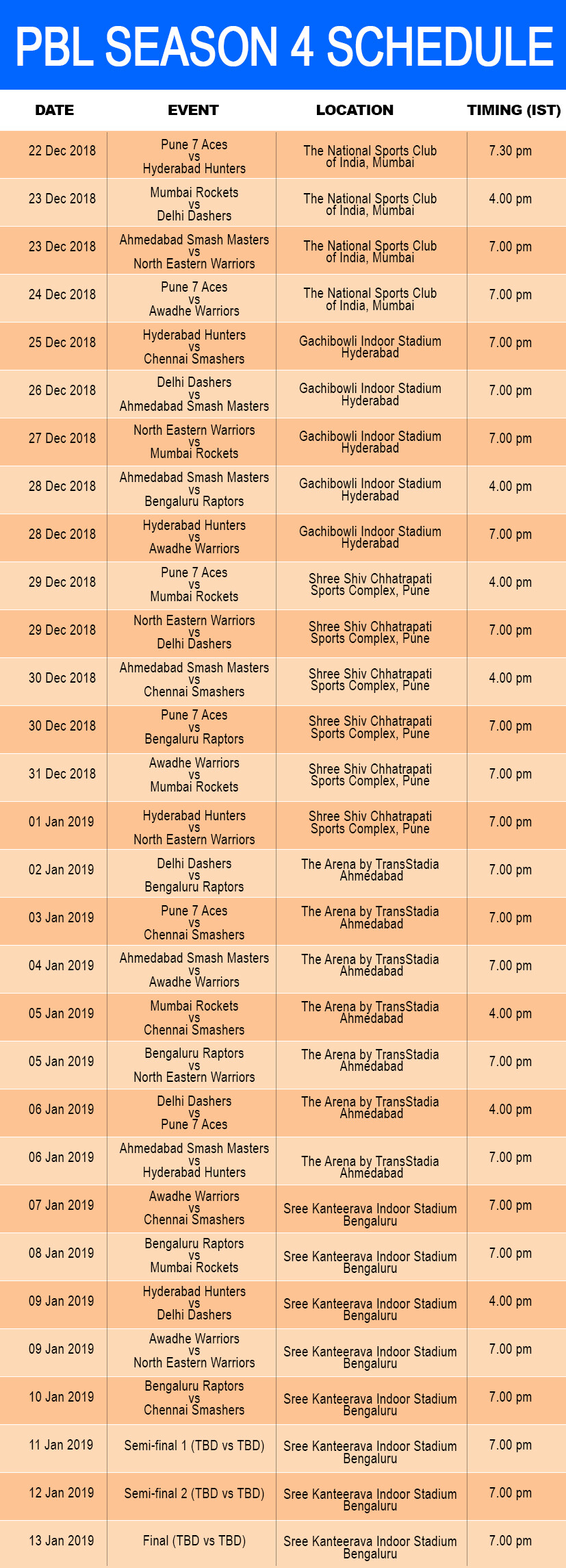 PBL will witness an encounter between nine teams — Delhi Dashers, Ahmedabad Smash Masters, Awadhe Warriors, Bengaluru Raptors, Mumbai Rockets, Hyderabad Hunters, Chennai Smashes, North Eastern Warriors and Pune 7 Aces. The teams will battle out for the title and prize purse of ₹6 crore with initial rounds being held in Mumbai and later continued by Hyderabad, Pune, Ahmedabad and semis and finals in Bengaluru.