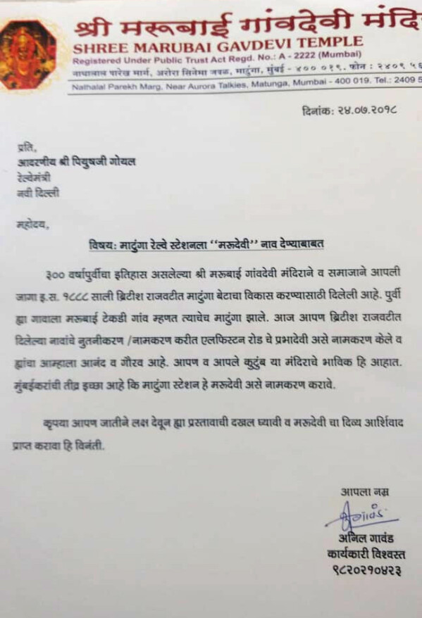 Shri Marubai Gaodevi Temple Group said that the connection of Marubai Devi with Matunga dates back to 300 years. The land of Matunga was given by the temple group during the British era in 1888 for development purposes.