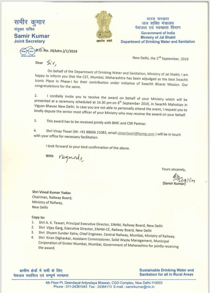 The Ministry of Jal Shakti and Department of Drinking Water and Sanitation recently announced that Chhatrapati Shivaji Maharaj Terminus (CSMT) station has been conferred upon as 'Best Swacch Bharat Iconic Place'. It has been awarded to CSMT due to its contribution in the Swacch Bharat Campaign that was launched by Prime Minister Narendra Modi.