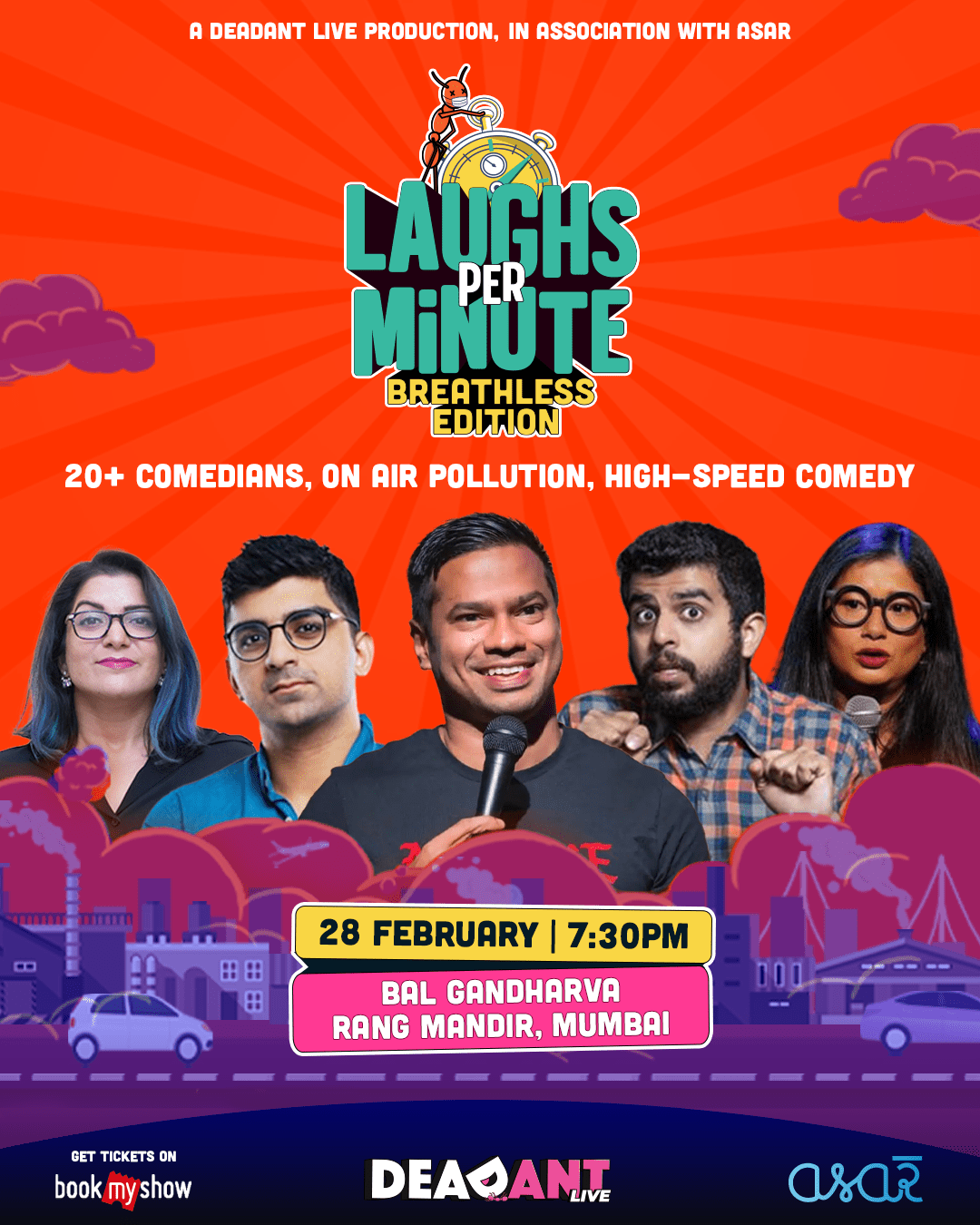 DeadAnt Laughs Per Minute: Breathless Edition will feature 20+ top comedians, including Daniel Fernandes, Aditi Mittal, Supriya Joshi, Raunaq Rajani, and Aadar Malik, as they transform AQI charts and smog-choked skies into hard-hitting punchlines that spark awareness and action.