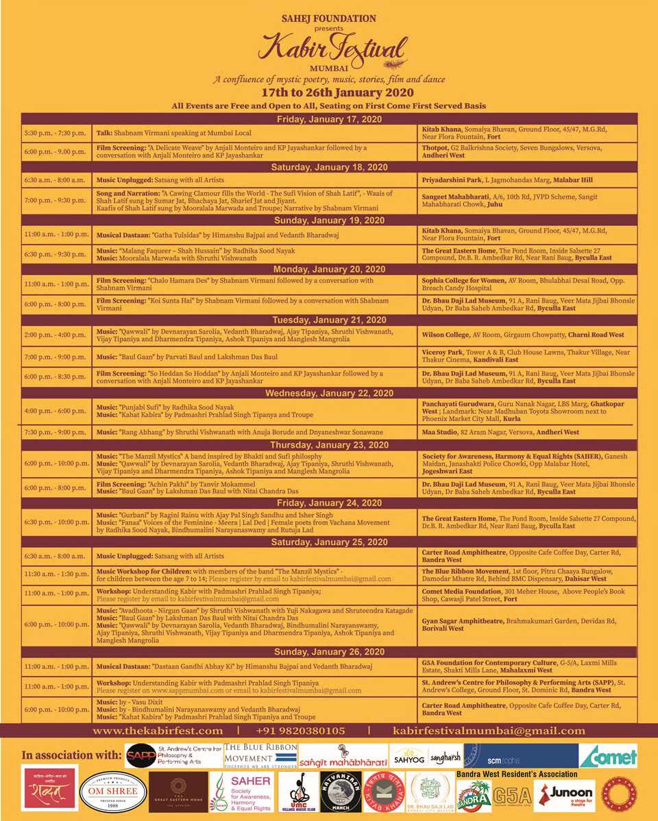 - 11:00 am - 1:00 pm: Workshop Understanding Kabir with Padmashri Prahlad Singh Tipaniya at St. Andrew’s Centre for Philosophy and Performing Arts, Bandra (W)