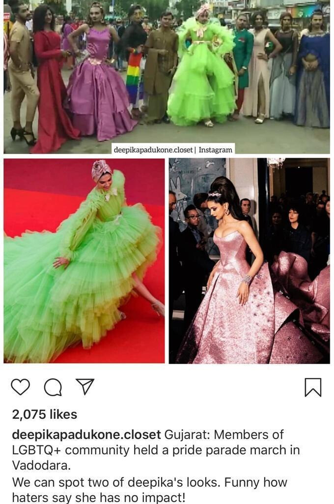गुजरात के शहर वडोदरा में हाल ही में LGBT समुदाय द्वारा एक प्राइड परेड का आयोजन किया गया था, जहां दीपिका का 2019 कांन्स और मेट गाला लुक काफी हिट रहा। इस विशेष परेड में समुदाय के कुछ लोग दीपिका के कांन्स और मेट गाला ऑउटफिट में नजर आए जो अपने ही अंदाज में बेहद खूबसूरत लग रहे थे।