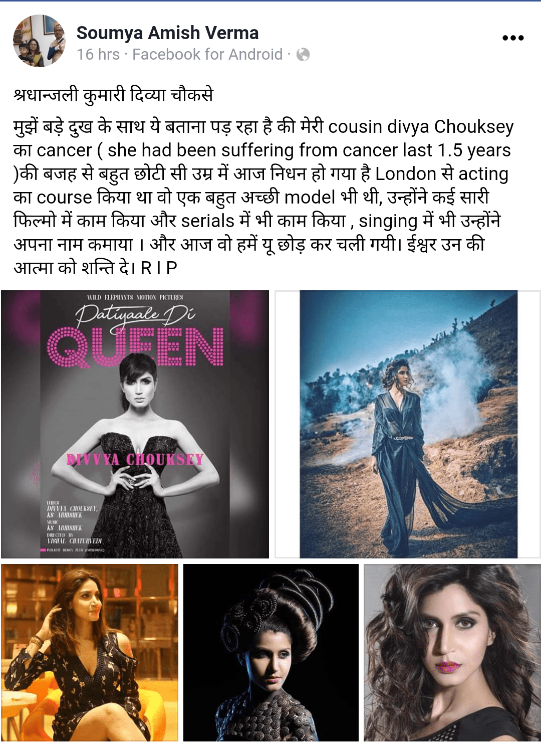 दिव्या की कजन सौम्या अमिश वर्मा ने निधन की जानकारी देते हुए फेसबुक पर लिखा, मुझें बड़े दुख के साथ ये बताना पड़ रहा है की मेरी कजन दिव्या चौकसी का कैंसर (वो पिछले डेढ़ साल से कैंसर से पीड़ित थीं) की बजह से बहुत छोटी सी उम्र में आज निधन हो गया है। उन्होंने लंदन से एक्टिंग का कोर्स किया था, वे एक बहुत अच्छी मॉडल भी थीं, उन्होंने कई सारी फिल्मों में काम किया और सीरियल्स में भी काम किया, सिंगिंग में भी उन्होंने अपना नाम कमाया। और आज वो हमें यू छोड़ कर चली गईं। ईश्वर उन की आत्मा को शांति दे। R I P.