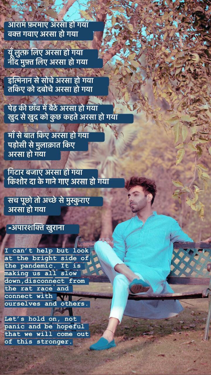 इसमें एक सबसे अच्छी बात ये है कि बहुत से लोगों को अपने परिवारजनों के साथ समय बिताने का मौका मिला है। ऐसे में इस बात से प्रेरित होकर दमदार अभिनेता अपारशक्ति खुराना ने एक दिल को छू लेने वाली कविता लिखी।