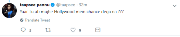 अली फजल के इस ट्वीट के बाद तापसी पन्नू ने उनसे हॉलीवुड में काम करने का चांल मांगा है। तापसी ने लिखा, यार तू अब मुझे हॉलीवुड में चांस देगा ना?