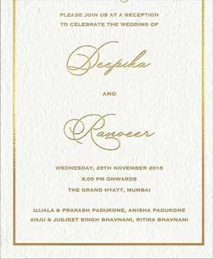 मीडिया रिपोर्ट्स के अनुसार दीपिका पहला रिसेप्शन बेंगलुरु में देगीं जिसमें उनके परिवार वालों और क़रीबी दोस्त शामिल होंगे जबकि दूसरा रिसेप्शन मुंबई में 28 नवंबर को ग्रैंड हयात होटल में आयोजित किया जायेगा जिसमें तमाम फ़िल्मी सितारें शिरकत करेंगे।