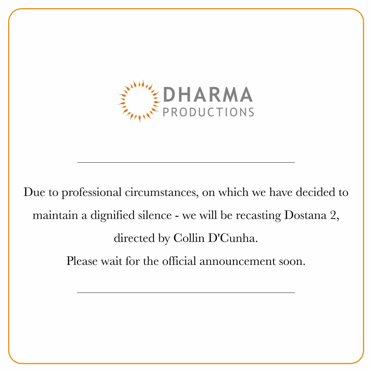 धर्मा प्रोडक्शन ने विज्ञप्ति जारी कर कहा, प्रोफेशनल कारणों के चलते हम शांत हैं और हमें दोस्ताना 2 की रिकास्टिंग करनी पड़ रही है। कृपया इंतजार करें।