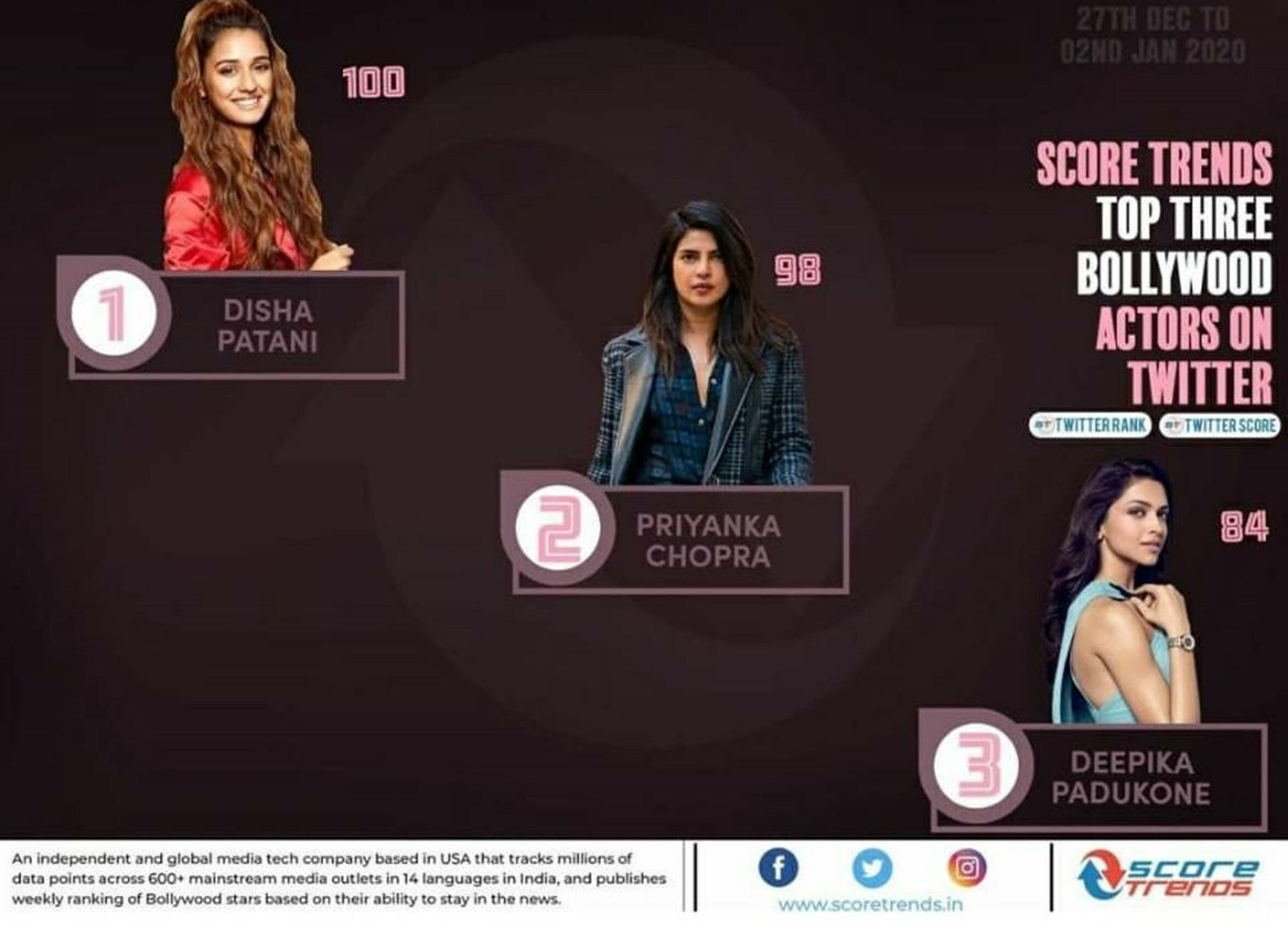 स्कोर ट्रेंड्स इंडिया के मुताबिक पिछले दिनों ट्विटर पर दिशा पाटनी, प्रियंका चोपड़ा जोनस और दीपिका पादुकोण यह बॉलीवुड की तीन सबसे लोकप्रिय अभिनेत्रियां रही हैं। सबसे अग्रणी स्थान पर दिशा पाटनी रही हैं। दूसरे स्थान पर प्रियंका चोपड़ा तो तीसरे स्थान पर दीपिका पादुकोण हैं।