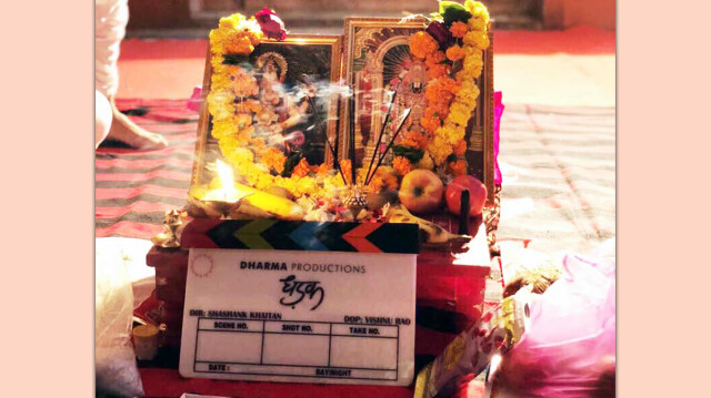 मुहूर्त की एक तस्वीर शेयर की गई है। इसमें एक्टर एक्ट्रेस के चेहरे नहीं दिखाए गए है। पर ईशान ने ब्लू शर्ट पहनी है जो जाह्नवी कपूर ने पिंक कलर का सूट पहना हुआ है। ये दोनों नदी के किनारे पर बैठे हुए हैं।