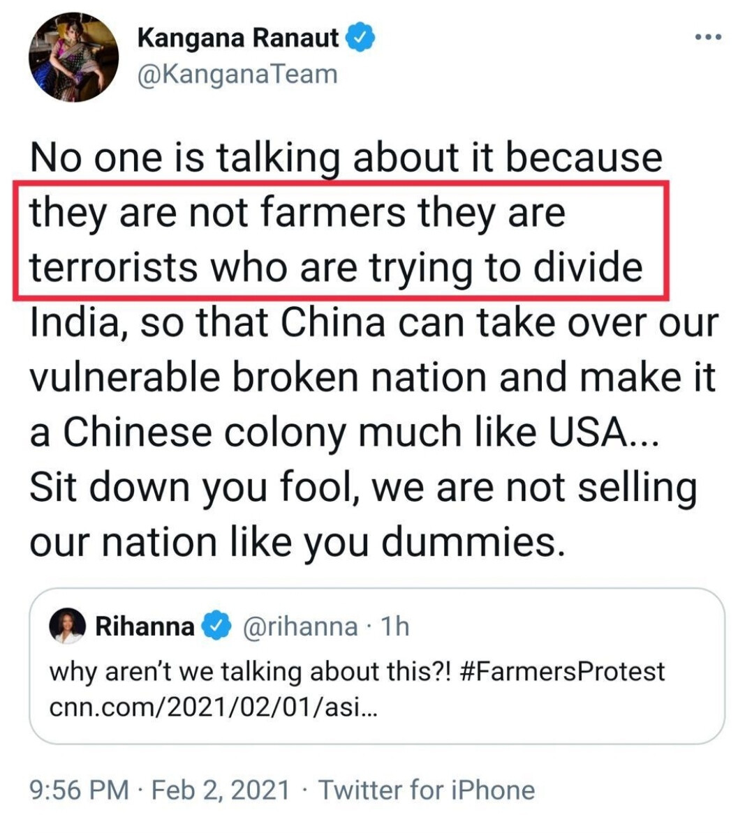हालांकि पॉप स्टार के इस ट्वीट पर बॉलीवुड अभिनेत्री कंगना रनौत (kangana ranaut) भड़क उठीं। उन्होंने रिहाना के ट्वीट को रीट्वीट कर लिखा कि, 'कोई भी बात इसलिए नहीं कर रहा है क्योंकि ये किसान नहीं, आतंकवादी हैं। जो भारत को बांटना चाहते हैं, ताकि चीन हमारे देश पर कब्जा कर ले और USA जैसी चाइनीज कॉलोनी बना दे। शांति से बैठो बेवकूफ। हम तुम्हारे जैसे मूर्ख नहीं हैं जो अपने देश को बेच दें।'