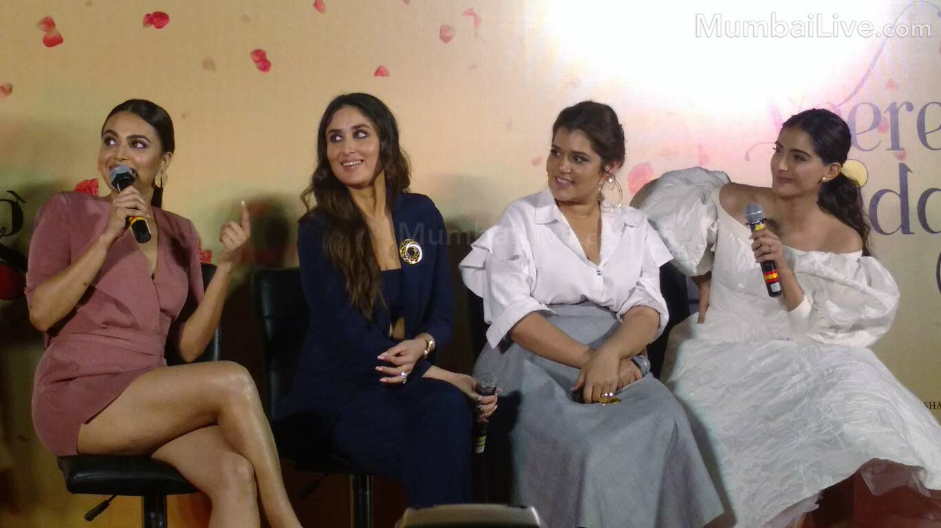 फिल्म ‘वीरे दी वेडिंग’ का आज जुहू स्थित पीवीआर थिएटर में ट्रेलर लॉन्च हो गया है। इस ट्रेलर लॉन्च के दौरान करीना कपूर खान, सोनम कपूर, स्वरा भास्कर और शिखा तलसानिया उपस्थित थी। जब इनसे शादी को लेकर सवाल किया गया तो करीना ने सोनम की शादी को लेकर चुटकी लेते हुए कहा कि शादी की जब भी बात आती है तो मुझे सोनम दिखाई देती है।