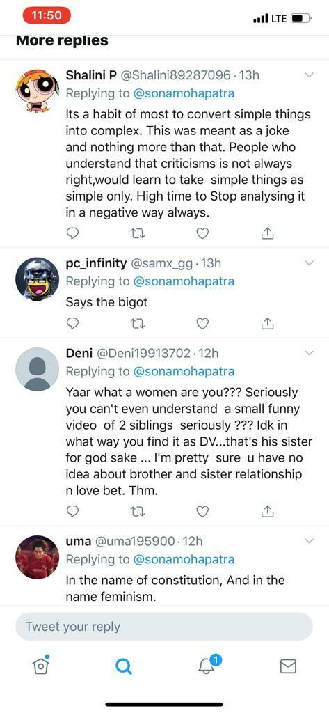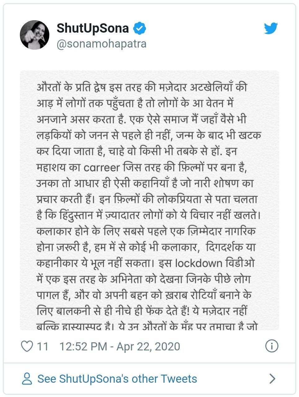 सिंगर सोना मोहपात्रा ने इस वीडियो पर सवाल उठाते हुए कार्तिक को कोसा, जिसपर कई लोगों ने सोशल मीडिया पर अपने विचार प्रगट किए। कई लोगों ने कार्तिक को सपोर्ट किया और सोना मोहपात्रा को फेक फेमिनिस्ट तक कह दिया।