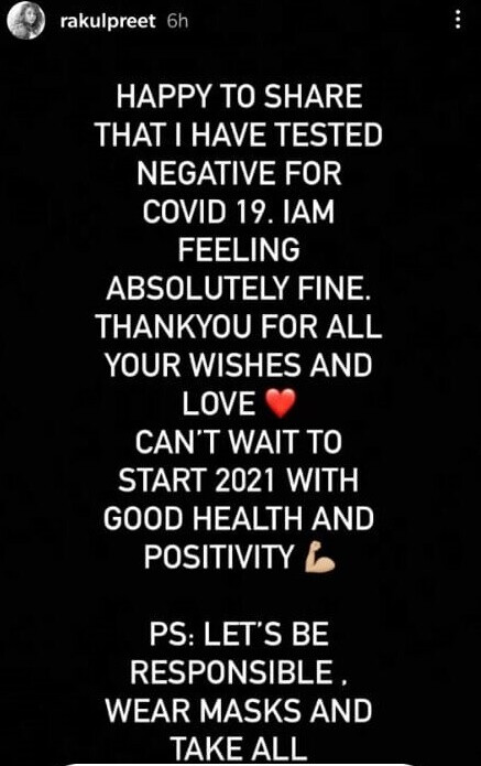रकुल ने इंस्टाग्राम पर अपनी कोरोना नेगेटिव होने की जानकारी शेयर करते हुए लिखा, आप सभी को बताते हुए खुशी हो रही है कि मैं कोविड-19 नेगेटिव आई हूं। मैं बिलकुल अच्छा महसूस कर रही हूं। आप सभी की शुभकामनाओं और प्रेम के लिए शुक्रिया। साल 2021 की शुरुआत बेहतर सेहत और सकारात्मकता के साथ शुरू करने का इंतजार नहीं कर सकती। कृपया आप भी जिम्मेदार बनें, मास्क पहनें और सावधानी बरतें।