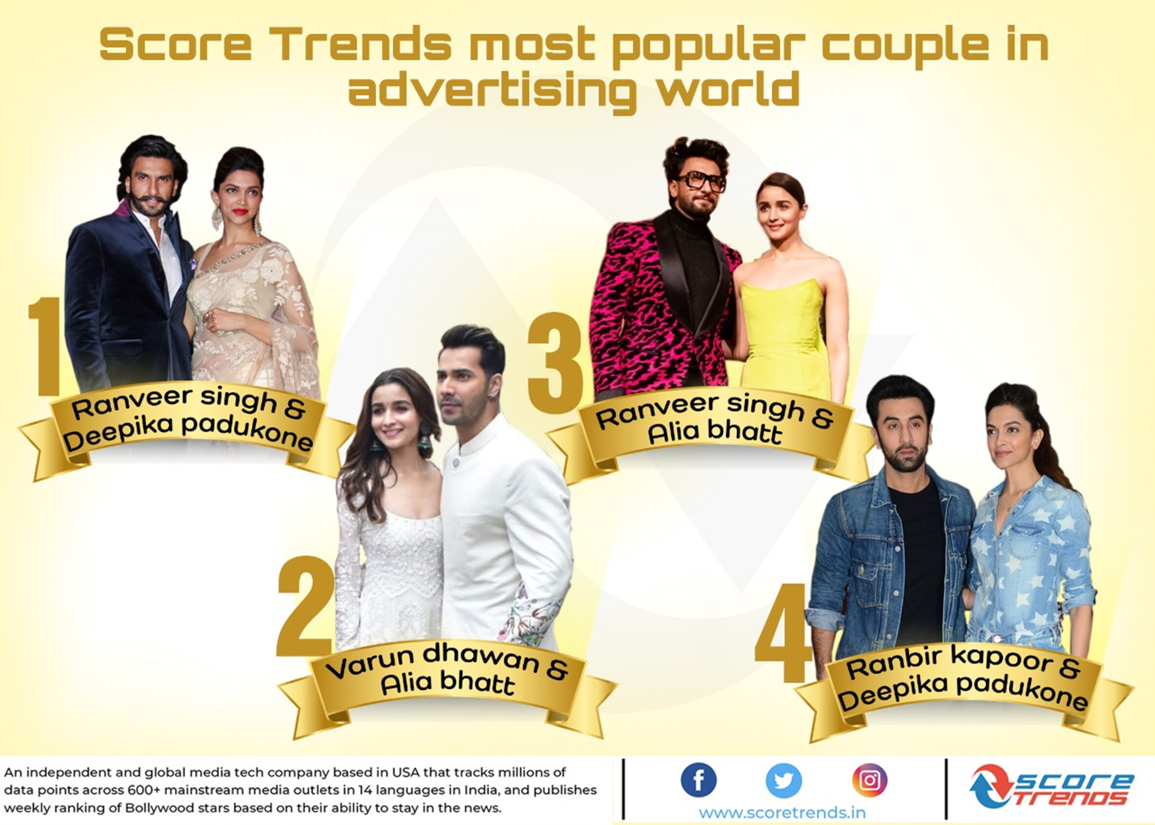 यह आंकड़े अमेरिका की मीडिया टेक कंपनी स्कोर ट्रेंड्स इंडिया द्वारा प्रमाणित किए गए हैं। रणवीर और दीपिका इन दिनों अपने LLYODS AC कमर्शियल के साथ लोकप्रियता के चार्ट पर 100 अंकों के साथ पहले स्थान पर बने हुए हैं। तो, वरुण और आलिया जोड़ी ने अपने प्रसिद्ध फ्रूटी एड कैम्पेन की वजह से 83.02 के साथ दूसरा रैंक हासिल किया है।