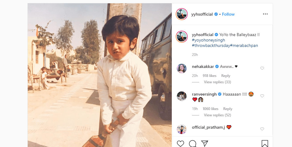 हनी सिंह बचपन की तस्वीर में काफी क्यूट लग रहे हैं, उन्होंने अपने हाथ में बैट पकड़ रखा है और क्रिकेट खेलने के मूड में नजर आ रहे हैं। हनी सिंह ने इंस्टाग्राम पर तस्वीर शेयर करते हुए लिखा, यो यो द बल्लेबाज!