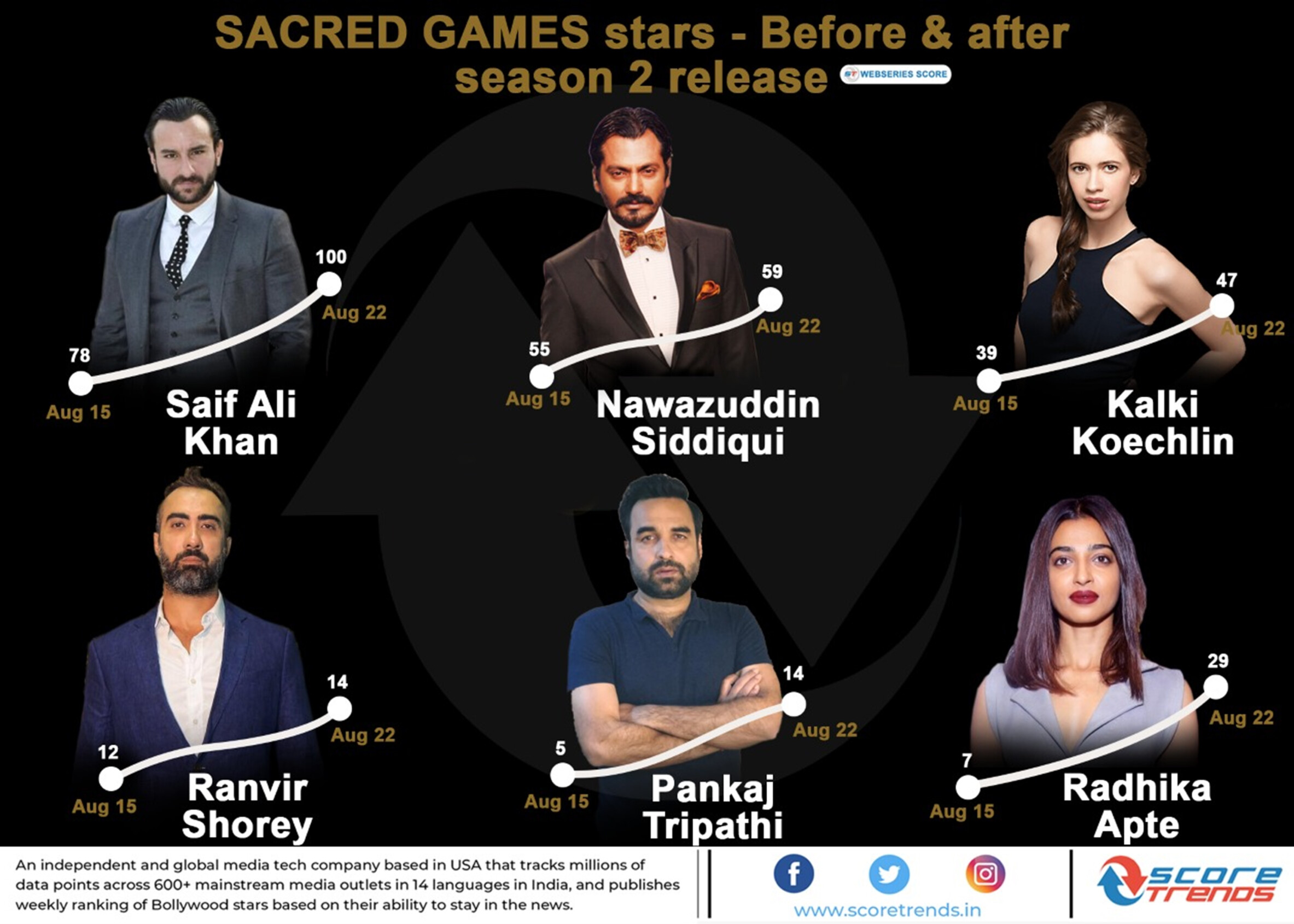 स्कोर ट्रेंड्स के सह-संस्थापक अश्वनी कौल खुलासा करते हैं, “शीर्ष स्थान पर पहूँचे सभी 6 अभिनेताओं की सैक्रेड गेम्स की वजह से काफी लोकप्रियता बढी दिखायी दे रहीं हैं। सैक्रेड गेम्स के पहले सीजन के बाद दर्शकों को काफी अरसे से दूसरे सीजन का इंतजार था। और अगस्त के पूरे महिने में हर हफ्ते इन सितारों के लोकप्रियता बढती दिखायी दी। सोशल, वायरल न्यूज़ डिजिटल न्यूज़ और न्यूज़पेपर्स में इनकी बहुत बड़ी फैन फॉलोइंग हमने पाई है।”