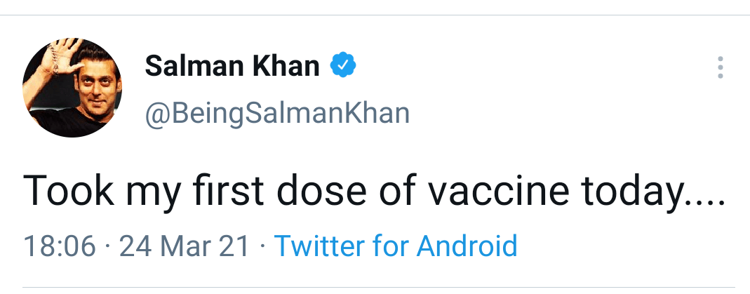 हालांकि बाद में सलमान खान ने सोशल मीडिया पर बताया है कि उन्होंने भी कोरोना वैक्सीन लगवा ली है। दरअसल बॉलीवुड के कई सेलेब्स कोरोना वैक्सीन लगवा रहे हैं। इस बीच दबंग सलमान खान ने भी कोरोना वैक्सीन लगवाई हैं। मंगलवार को संजय दत्त ने भी कोरोना वैक्सीन का पहला डोज लिया है।
