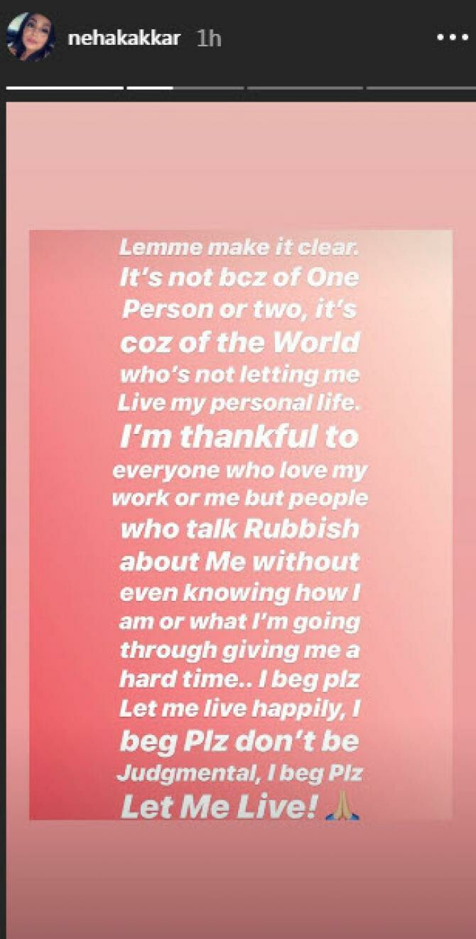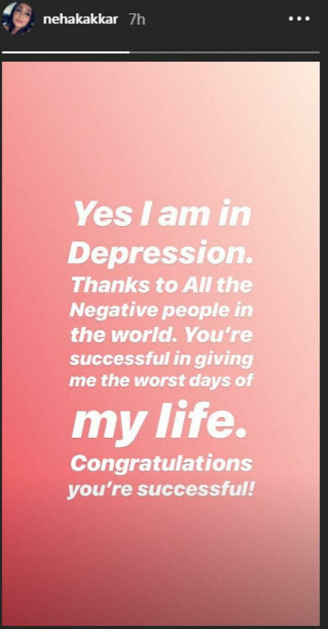 नेहा ने अपने इंस्टाग्राम अकाउंट पर लिखा, हां, मैं डिप्रेशन में हूं। इस दुनिया के सभी नेगेटिव लोगों का आभार। आप लोग मुझे जिंदगी का सबसे खराब दौर देने में सफल रहे। मुबारक हो, आप सफल रहे। मैं आपको एक बात साफ करना चांहूगी कि ऐसा किसी एक या दो लोगों की वजह से नहीं है, यह उस दुनिया की वजह जो मुझे मेरी पर्सनल लाइफ भी जीने नहीं दे रही है।