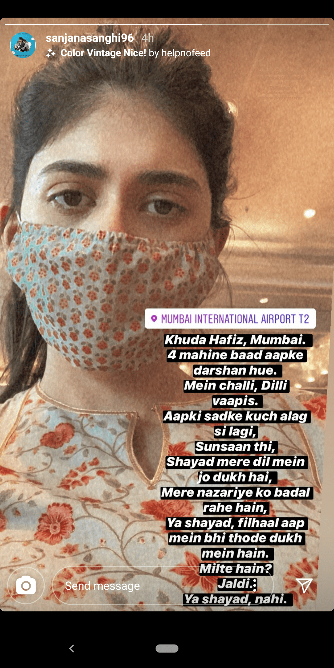 बयान दर्ज कराने के बाद आज संजना ने एक बड़ा कदम उठाया है, उन्होंने इस इंडस्ट्री को छोड़ने का मन बना लिया है। संजना ने अपनी इंस्टाग्राम स्टोरी में लिखा है, खुदा हाफिज मुंबई, 4 महीने बाद आपके दर्शन हुए। मैं चली दिल्ली वापस। आपकी सड़कें कुछ अलग सी लगीं। सुनसान थी, शायद मेरे दिल में जो दुख है, मेरे नजरिए को बदल रहे हैं। या शायद, फिलहाल आप में भी थोड़े दुख में हैं। मिलते हैं जल्दी, या शायद नहीं।