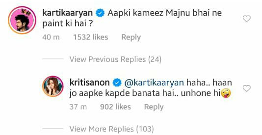 यह सब तब हुआ जब कृति ने अपनी तस्वीरों का एक कोलाज इंस्टाग्राम पर पोस्ट किया और कुछ ही समय में, कार्तिक ने उन्हें यह कहते हुए चिढ़ाया कि, "आपकी कमीज़ मजनू भी ने पेंट की है?" इसपर कृति ने जवाब देते हुए लिखा, "हां हां जो आपके कपड़े बनाता है ...उन्होंने ही।"