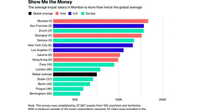 एचएसबीसी बैंक इंटरनेशनल द्वारा कराये गए एक सर्वे के मुताबिक मुंबई में जो विदेशी काम करते है उनकी सलाना कमाई 2.17 लाख डॉलर (1.40 करोड़ रुपये) है। और इस कमाई का आंकड़ा ग्लोबल एक्सपैट ऐवरेज का दोगुना है।
