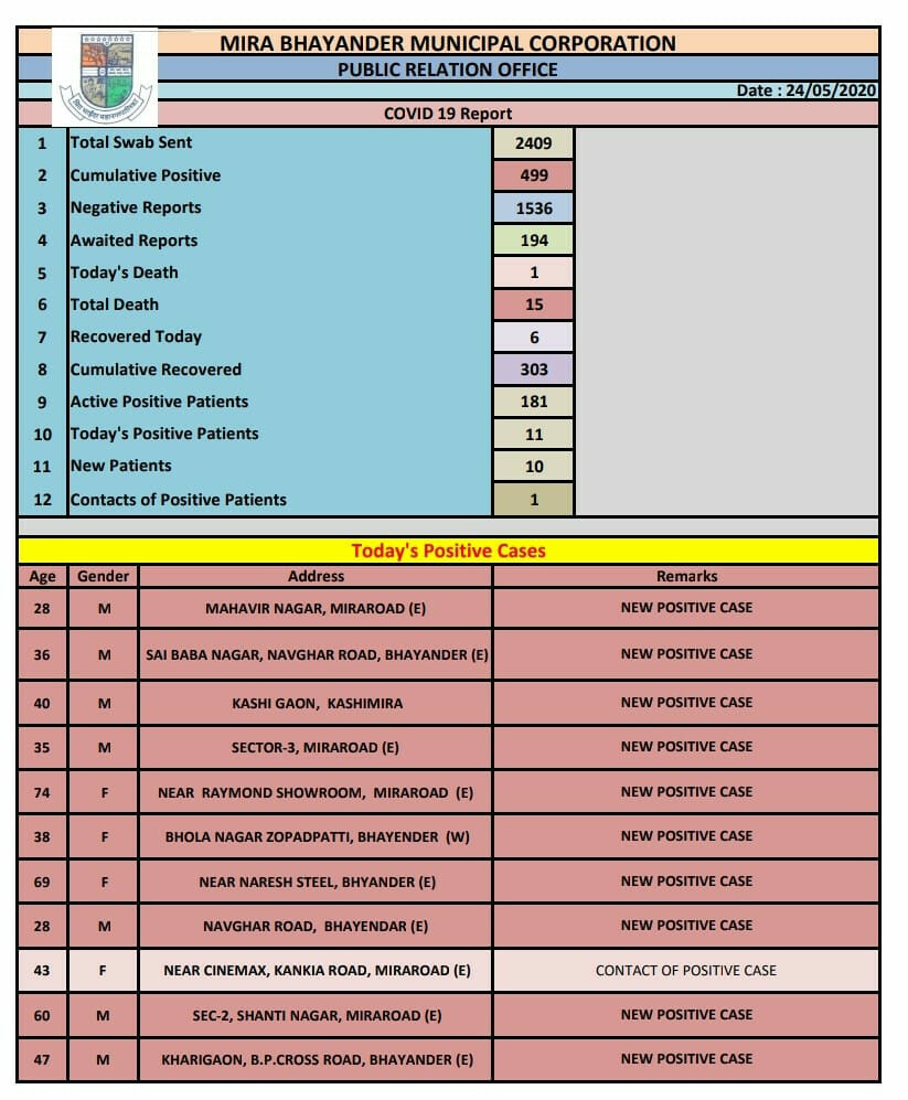 अब तक मीरा-भायंदर में COVID-19 के टोटल 499 पॉजिटिव केस सामने आ चुके हैं और अब तक 15 लोगों की जान भी जा चुकी है।