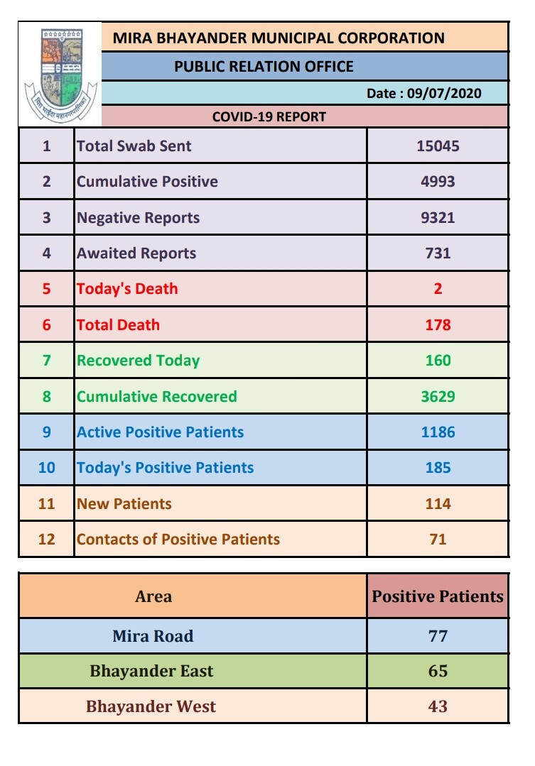 अब तक मीरा-भायंदर में COVID-19 के टोटल 4993 पॉजिटिव केस सामने आ चुके हैं और साथ ही इस बीमारी से अब तक 178 लोगों की जान भी जा चुकी है।
