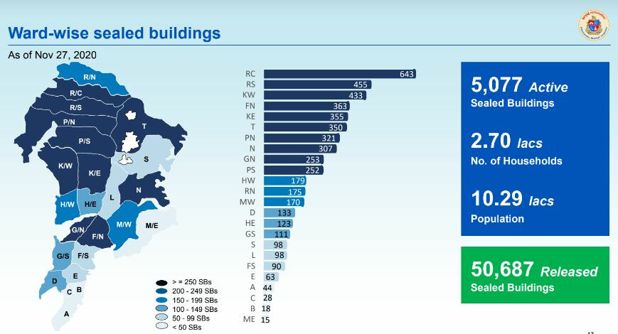 वार्ड जीएन (दादर), एस (भांडुप), के-ईस्ट (अंधेरी पूर्व), एन (घाटकोपर) में सबसे अधिक क्षेत्र सील किए गए हैं, जबकि वार्ड आर-सेंट्रल (बोरिवली), आर-साउथ (कांदिवली, के-वेस्ट) (अंधेरी वेस्ट), एफ-नॉर्थ (माटुंगा) और के-ईस्ट (अंधेरी ईस्ट) में सबसे ज्यादा इमारतें सील हैं।