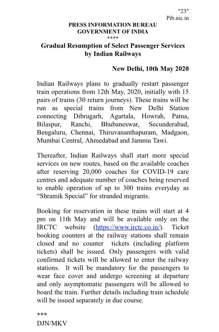 रेलवे मंत्रालय के द्वारा जारी एक परिपत्रक के अनुसार भारतीय रेलवे 12 मईसे यात्री ट्रेन शुरू करेगी, पहले 15 ट्रेन चलेंगी। डिब्रूगढ़, अगरतला, हावड़ा, पटना, बिलासपुर, रांची, भुवनेश्वर, सिकंदराबाद, बेंगलुरु, चेन्नई, तिरुवनंतपुरम, मडगांव, मुंबई सेंट्रल, अहमदाबाद और जम्मू तवी को जोड़ने वाली नई दिल्ली स्टेशन से विशेष ट्रेन चलेंगी। इसके साथ ही रेलवे ने कहा है कि आनेवाले समय मे कोच की उपलब्धता के अनुसार और भी गाड़ियां चलाई जा सकती है।