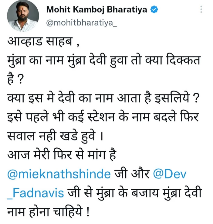महाराष्ट्र के मुख्यमंत्री और उपमुख्यमंत्री को संबोधित करते हुए मोहित ने मुंब्रा रेलवे स्टेशन का नाम बदलकर मुंब्रा देवी करने की मांग की है।