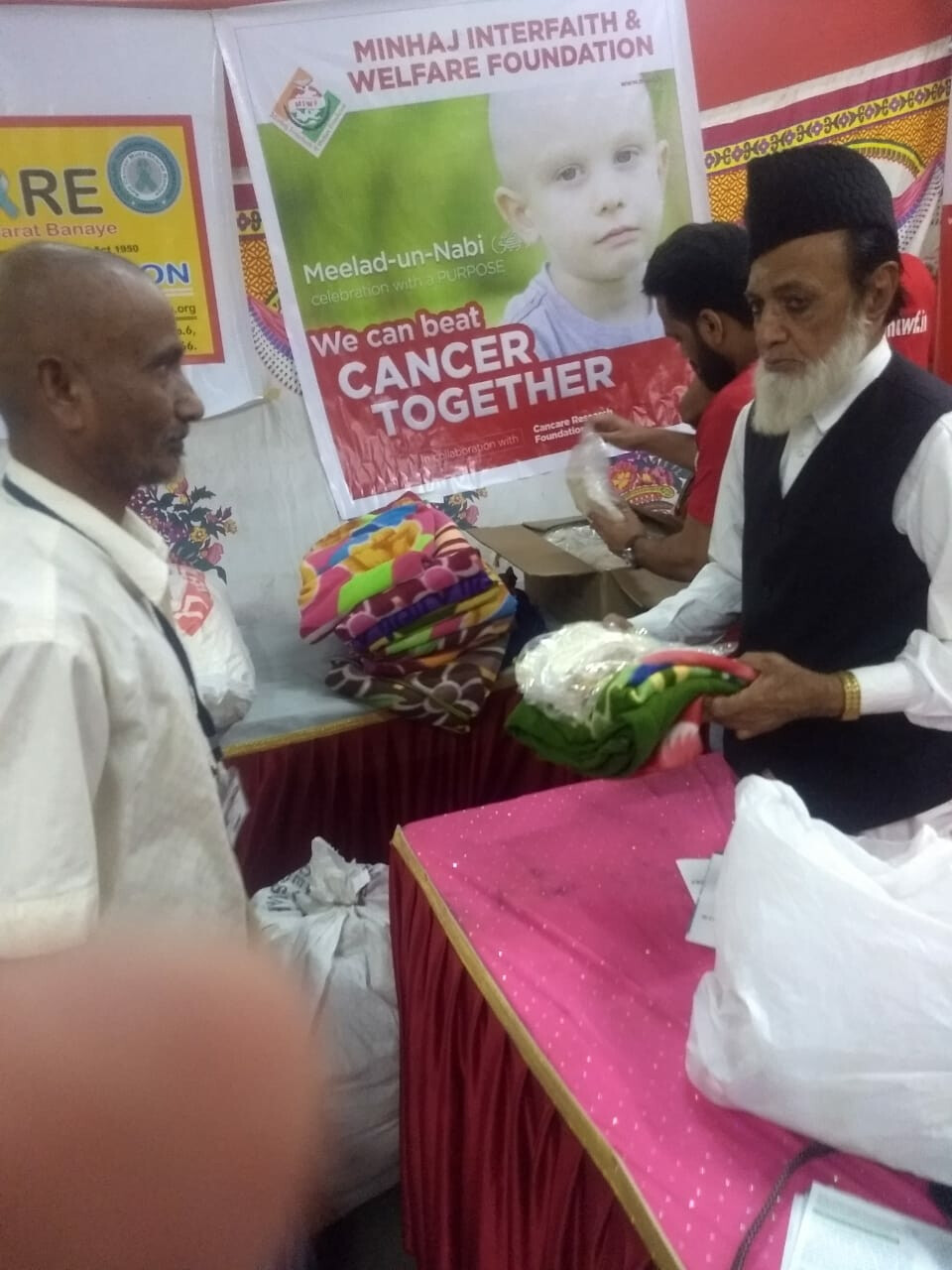 कैनकेयर रिसर्च फाउंडेशन, हाजीपीर हज टूर्स और मिनाज फाउंडेशन के सहयोग से नूरी दर्गा मस्जिद परेल मे रेहनेवाले कैंसर मरिजों को ईदे मिला दुन नबी के मौके पर कंबल, ड्राय फ्रुटस, रवा, शक्कर,बोनविचा , होर्लीक्स जैसी जरुरतमंद चीजें बाटी गई। इस मौके पर हजरत मौलाना अली मोहम्मद कच्छी दादर साहेब ने मरीजों के साथ कुछ वक्त बिताया और उनकी हौसला अफजाई भी की।