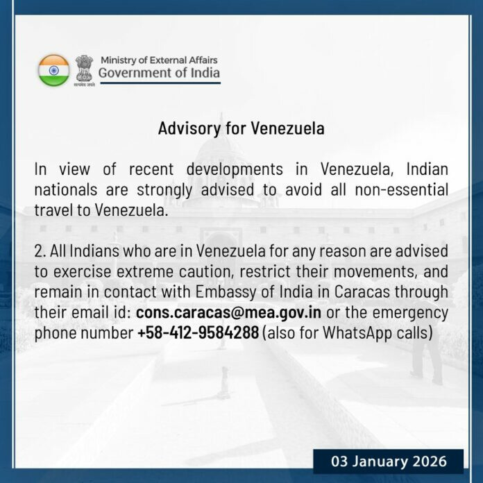 विदेश मंत्रालय की ओर से जारी नोटिस के मुताबिक, जो भारतीय नागरिक अभी वेनेजुएला में रह रहे हैं, उन्हें बहुत ज़्यादा सावधानी बरतनी चाहिए। वहां रहने वाले भारतीयों को सलाह दी गई है कि वे अपनी आवाजाही कम करें और जितना हो सके सुरक्षित जगहों पर रहें। साथ ही, नागरिकों से किसी भी इमरजेंसी में मदद के लिए काराकास में भारतीय दूतावास के लगातार संपर्क में रहने की अपील की गई है।