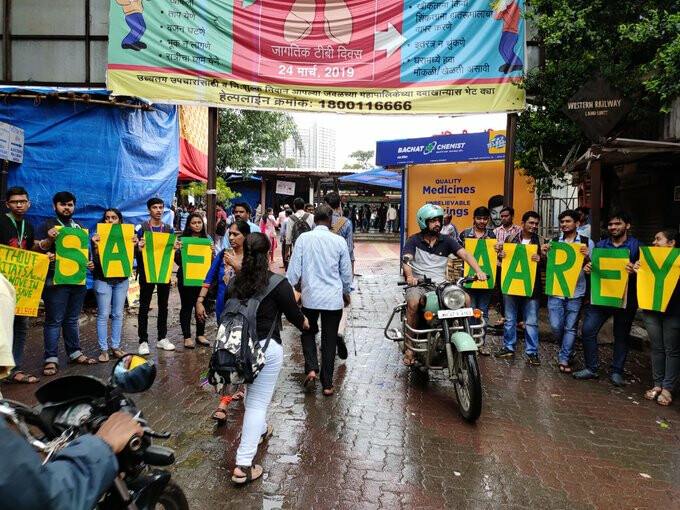 बुधवार को कांदिवली स्टेशन पर KES कॉलेज के छात्रों ने आरे में पेड़ काटने के विरोध में किया प्रदर्शन। इस विरोध प्रदर्शन में कॉलेज के 20 से ज्यादा NSS के छात्र शामिल हुए।