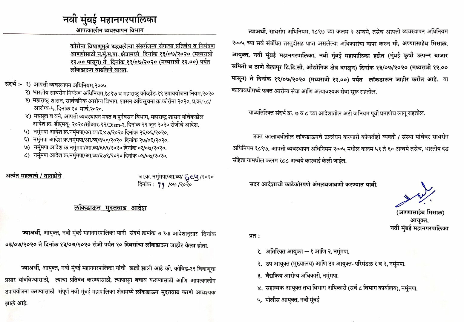 नवी मुंबई में 3 तारीख से जारी लॉकडाउन को अब और भी दिनों के लिए बढ़ा दिया गया है। दरअसल 3 जुलाई को नवी मुंबई में 13 जुलाई तक लॉकडाउन की घोषणा की गई थी, हालांकी अब इस लॉकडाउन को 13 जुलाई से बढ़ाकर 19 जुलाई तक कर दिया गया है। नवी मुंबई म्युनिसिपल कॉर्पोरेशन की ओर से जारी नये आदेश के मुताबिक अब 13 जुलाई की रात 12 बजे से 19 जुलाई की रात 12 बजे तक कड़क लॉकडाउन लगाया गया है।