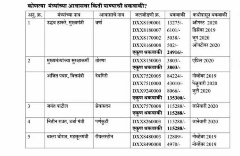 आरटीआई कार्यकर्ता (RTI activist) शकील अहमद शेख ने मुंबई नगर निगम की वेबसाइट से पानी के बकाया के बारे में जानकारी एकत्र की है। इस जानकारी के अनुसार, जिन बंगले के पानी का बिल बाकी है, उसमें मुख्यमंत्री उद्धव ठाकरे (वर्षा बंगला), मुख्यमंत्र्यांच्या सुरक्षाकर्मी (तोरणा), अर्थमंत्री अजित पवार (देवगिरी), जयंत पाटील (सेवासदन), नितीन राऊत, उर्जा मंत्री (पर्णकुटी), बालासाहेब थोराट, राजस्व मंत्री (रॉयलस्टोन), विरोधी पक्ष के नेता देवेंद्र फडणवीस (सागर), अशोक चव्हाण (मेघदूत) उद्योगमंत्री सुभाष देसाई (पुराने), दिलीप वलसे पाटील (शिवगिरी), सार्वजनिक बांधकाम (सार्वजनिक उपक्रम) मंत्री एकनाथ शिंदे (नंदनवन), राजेश टोपे (जेतवन), नाना पाटोले, विधानसभा अध्यक्ष (चित्रकुट), राजेंद्र शिंगे (सातपुडा), नवाब मलिक (मुक्तागीरी), छगनराव भुजबल (रामटेक), रामराजा निंबालकर विधानभवन सभापती (अजंता) और सह्याद्री गेस्ट हाउस का भी नाम शामिल है।