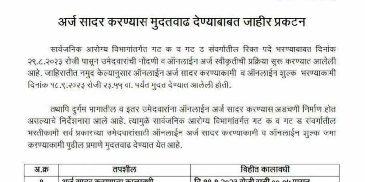 स्वास्थ्य विभाग के अंतर्गत ग्रुप 'सी' और ग्रुप 'डी' संवर्ग के विभिन्न पदों पर भर्ती प्रक्रिया चल रही है। इन रिक्त पदों पर भर्ती के लिए ऑनलाइन आवेदन स्वीकार किये जा रहे हैं। आवेदन जमा करने के लिए पंजीकरण 29 अगस्त 2023 से खुला है और अंतिम तिथि 18 सितंबर 2023 थी। (Maharashtra Last date to apply for Health Department recruitment extended till 22 September)
